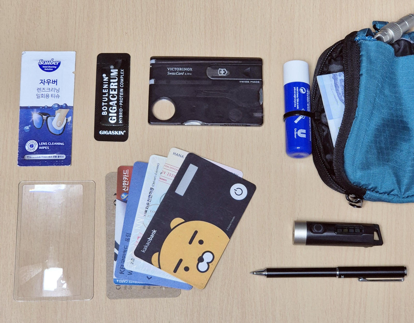 - 스위스카드 라이트: 카드형 멀티툴 계의 근본인 스위스카드요. 볼펜, 핀, 편지칼, 족집게, 가위, 돋보기, 4종 드라이버, LED 전구를 갖춘, 흠잡을 데 없는 물건이오. 소햏은 뒷면에 아크릴거울을 잘라 붙여두었다오. 이 물건은 기내 반입이 허용되지 않을 때가 많으니, 항공여행 때에는 빼두어야 하오.